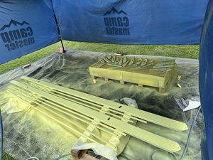 Primered rear wing spars, stringers, aileron and flap ribs, inspection hatch components, ribs 8R and 10R, rudder tip skin and various other wing ribs (trailing edge etc.), brackets and components.