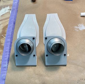 Yesterday I painted the vent assemblies. First primed with Stewart EkoPrime then Smoke Grey EkoCrylic like the rest of the cockpit. I elected to brush it on vs getting out the spray gun. I knew the paint quality would suffer but I reasoned since the vent assemblies are completely hidden underneath the panel it really wouldn't matter. My desire to get the vents installed and finished outweighed the hassle and time factor of setting up the gun, compressor and doing what was needed to prevent overspray from nuking my garage. As expected, there were brush marks, but I was able improve the look considerably by wet sanding everything with 1000/1500/2000 grit paper. There are many interior parts left like the seats, access covers, rollbar etc. that will need be spray painted since they are all highly visible components. I got the vents bolted together and sealed with clear RTV then bonded and clamped into place with more RTV. Fortunately, I'd thought through how to clamp everything ahead of time. It took 3 hands to keep everything aligned and get the clamps installed.
